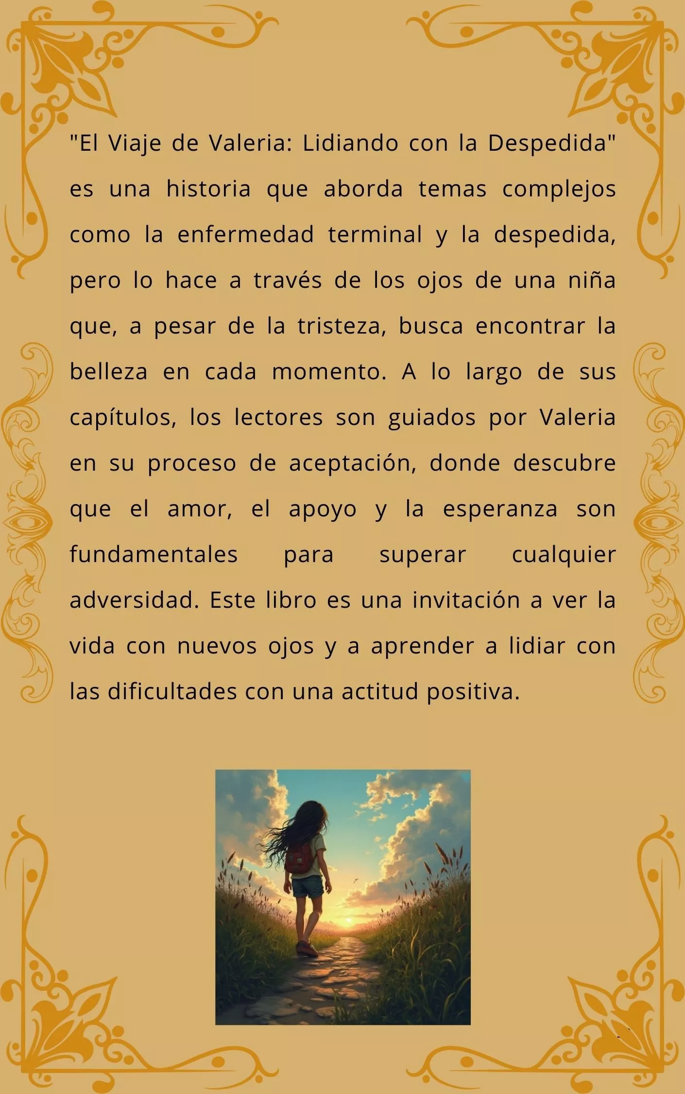 Este libro relata el viaje emocional de Valeria, una niña que enfrenta una situación difícil: la enfermedad terminal de su mejor amigo. Con valentía y optimismo, Valeria nos enseña que la vida puede seguir siendo bella incluso en los momentos más oscuros. Este libro busca ofrecer consuelo y esperanza a todos aquellos que, como Valeria, atraviesan situaciones difíciles. A través de esta historia, los lectores podrán aprender a encontrar la alegría en las pequeñas cosas y a enfrentar las adversidades con una actitud positiva.