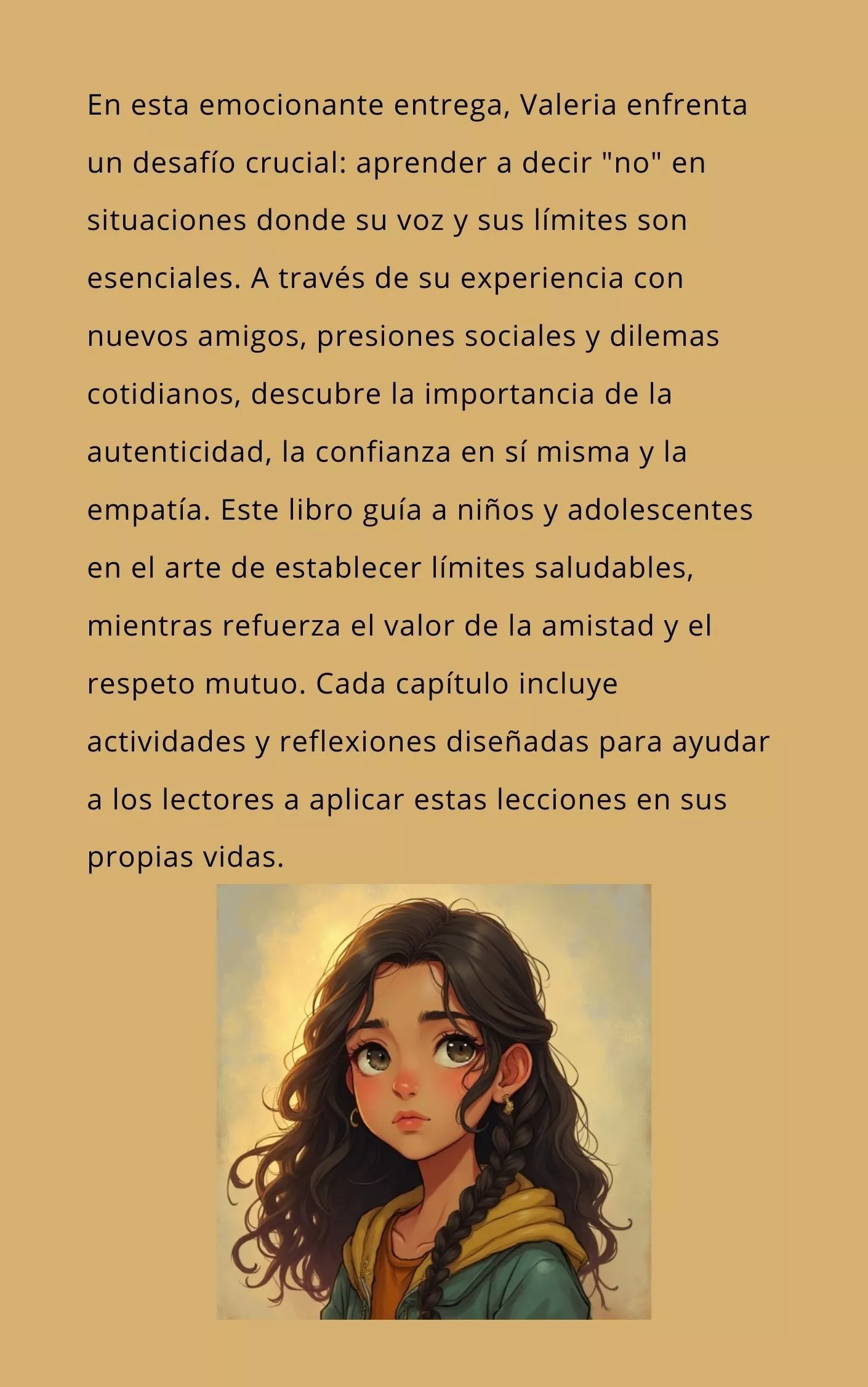 En esta emocionante entrega, Valeria enfrenta un desafío crucial: aprender a decir "no" en situaciones donde su voz y sus límites son esenciales. A través de su experiencia con nuevos amigos, presiones sociales y dilemas cotidianos, descubre la importancia de la autenticidad, la confianza en sí misma y la empatía. Este libro guía a niños y adolescentes en el arte de establecer límites saludables, mientras refuerza el valor de la amistad y el respeto mutuo. Cada capítulo incluye actividades y reflexiones diseñadas para ayudar a los lectores a aplicar estas lecciones en sus propias vidas.