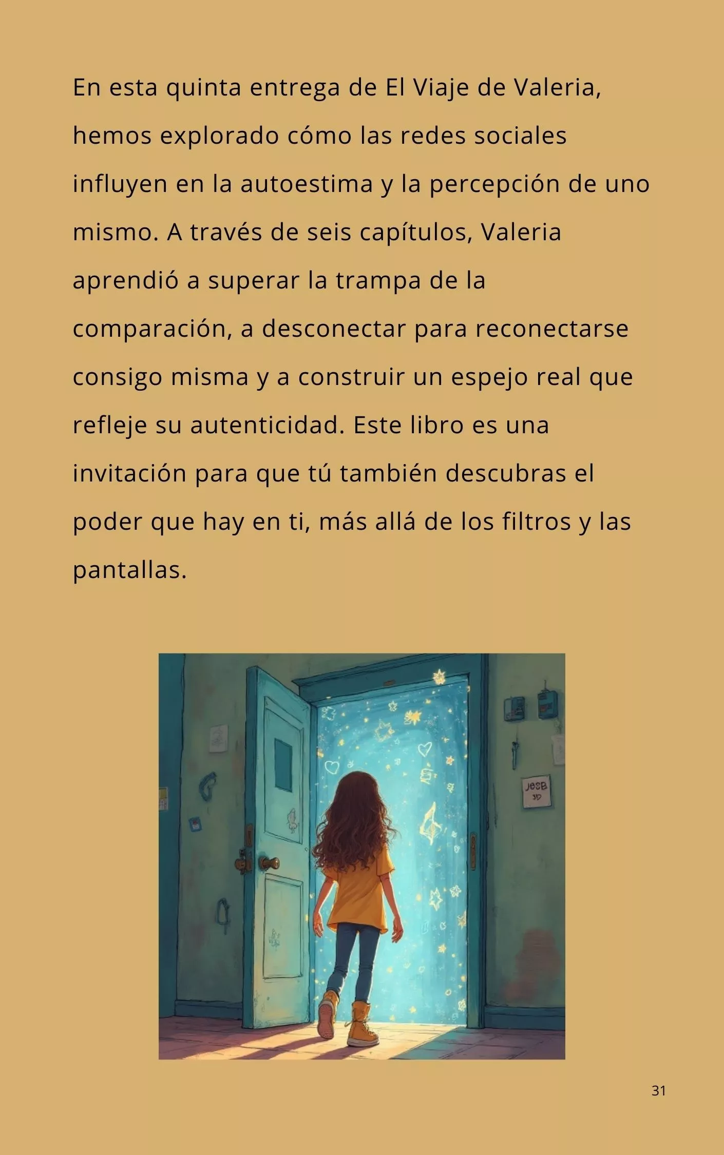 En esta quinta entrega de El Viaje de Valeria, hemos explorado cómo las redes sociales influyen en la autoestima y la percepción de uno mismo. A través de seis capítulos, Valeria aprendió a superar la trampa de la comparación, a desconectar para reconectarse consigo misma y a construir un espejo real que refleje su autenticidad. Este libro es una invitación para que tú también descubras el poder que hay en ti, más allá de los filtros y las pantallas.