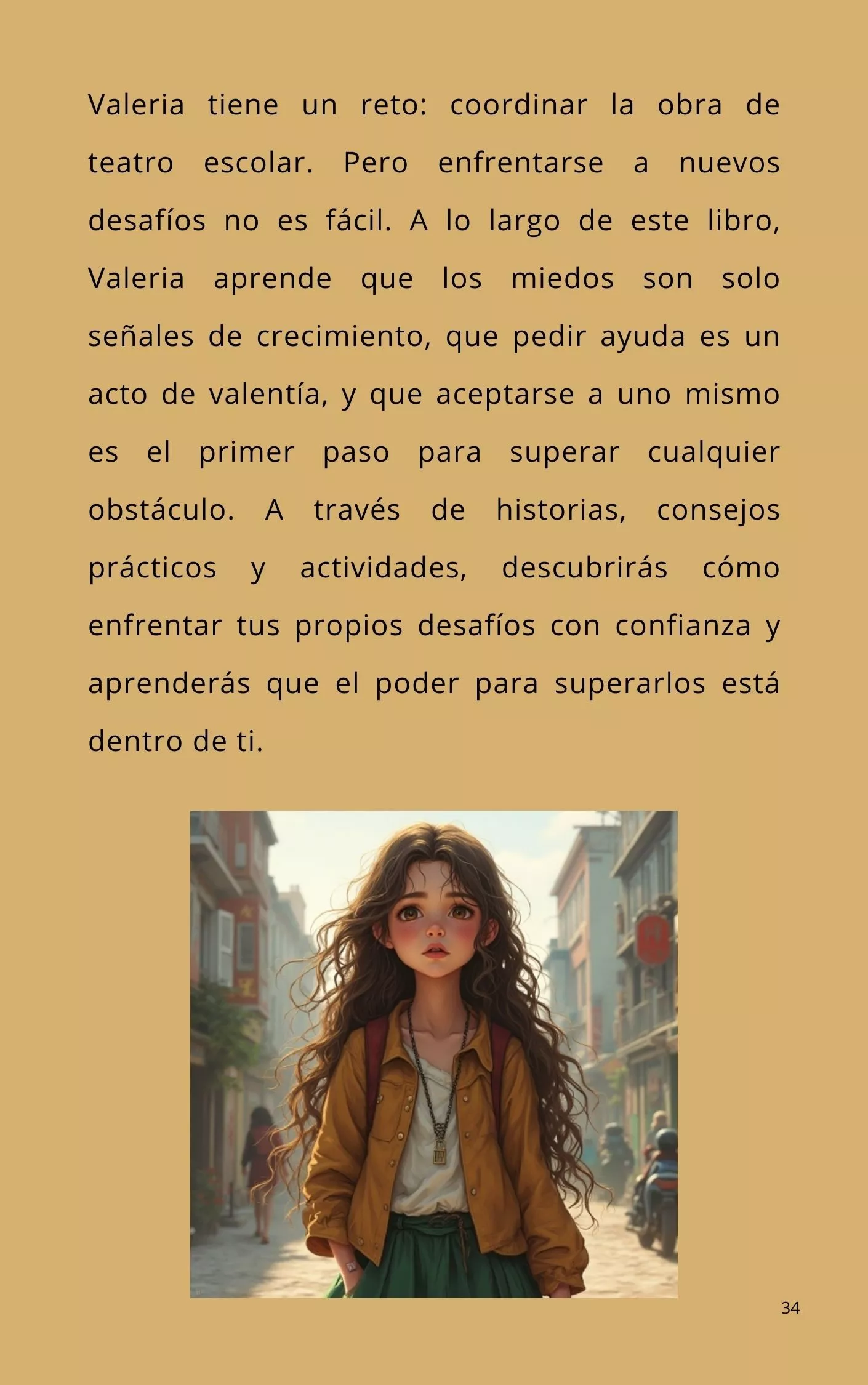 Valeria tiene un reto: coordinar la obra de teatro escolar. Pero enfrentarse a nuevos desafíos no es fácil. A lo largo de este libro, Valeria aprende que los miedos son solo señales de crecimiento, que pedir ayuda es un acto de valentía, y que aceptarse a uno mismo es el primer paso para superar cualquier obstáculo. A través de historias, consejos prácticos y actividades, descubrirás cómo enfrentar tus propios desafíos con confianza y aprenderás que el poder para superarlos está dentro de ti.