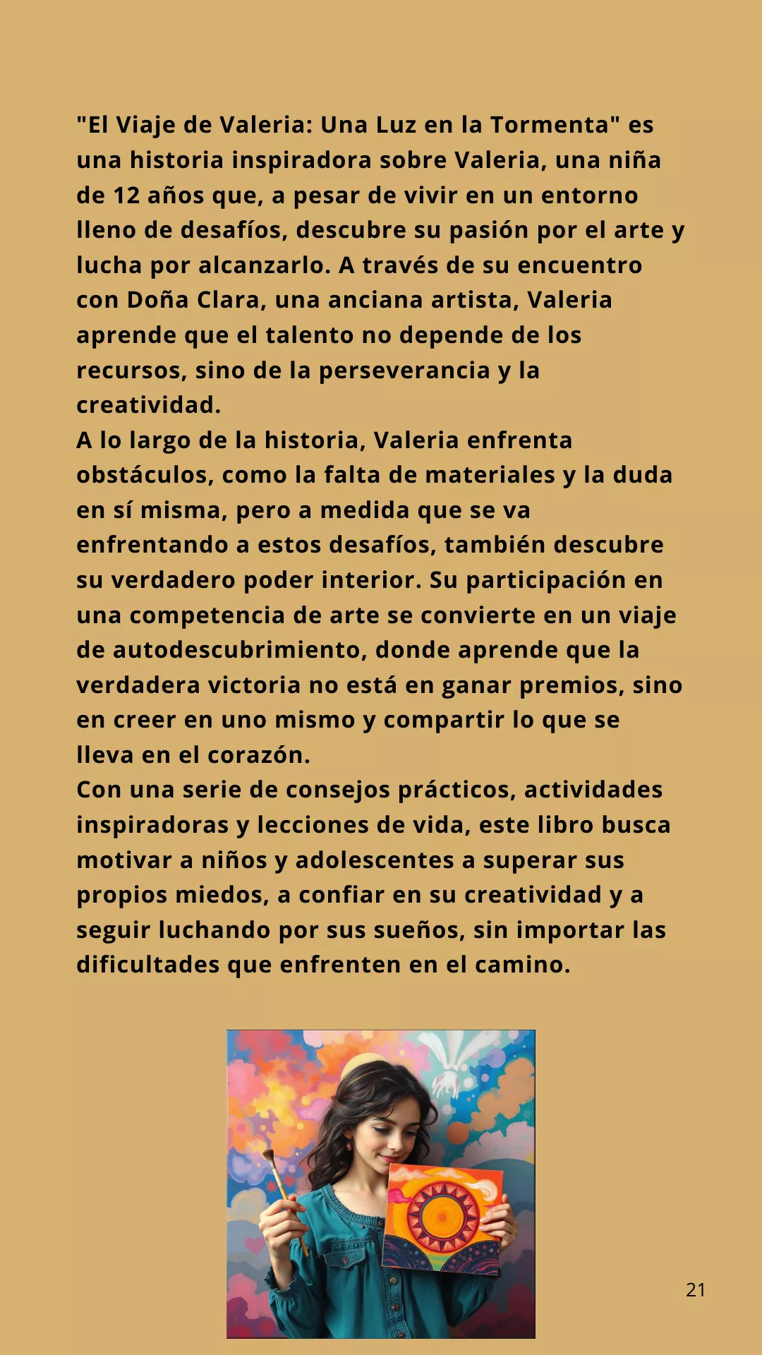 "El Viaje de Valeria: Una Luz en la Tormenta" es una historia inspiradora sobre Valeria, una niña de 12 años que, a pesar de vivir en un entorno lleno de desafíos, descubre su pasión por el arte y lucha por alcanzarlo. A través de su encuentro con Doña Clara, una anciana artista, Valeria aprende que el talento no depende de los recursos, sino de la perseverancia y la creatividad.