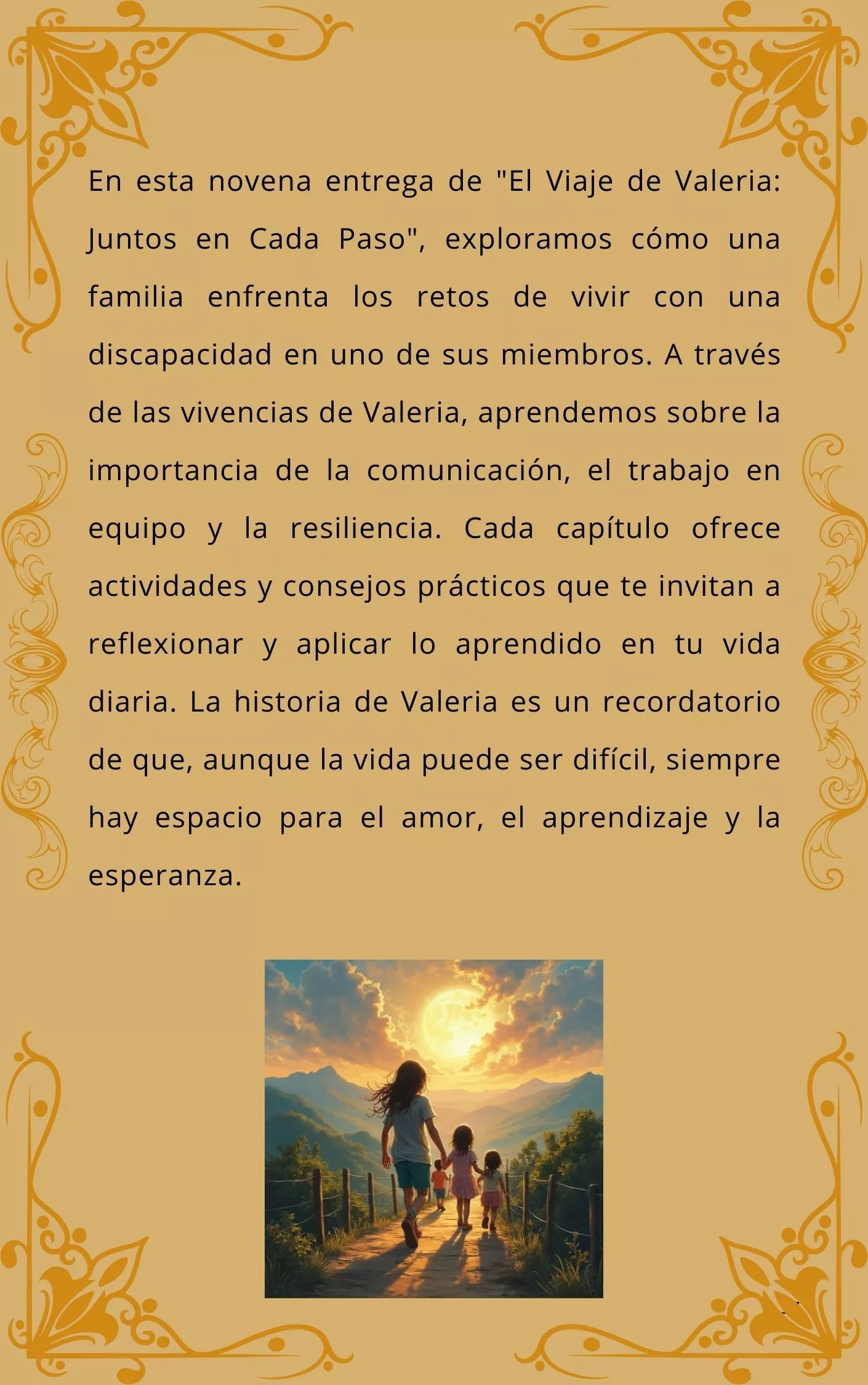 En esta novena entrega de "El Viaje de Valeria: Juntos en Cada Paso", exploramos cómo una familia enfrenta los retos de vivir con una discapacidad en uno de sus miembros. A través de las vivencias de Valeria, aprendemos sobre la importancia de la comunicación, el trabajo en equipo y la resiliencia. Cada capítulo ofrece actividades y consejos prácticos que te invitan a reflexionar y aplicar lo aprendido en tu vida diaria. La historia de Valeria es un recordatorio de que, aunque la vida puede ser difícil, siempre hay espacio para el amor, el aprendizaje y la esperanza.