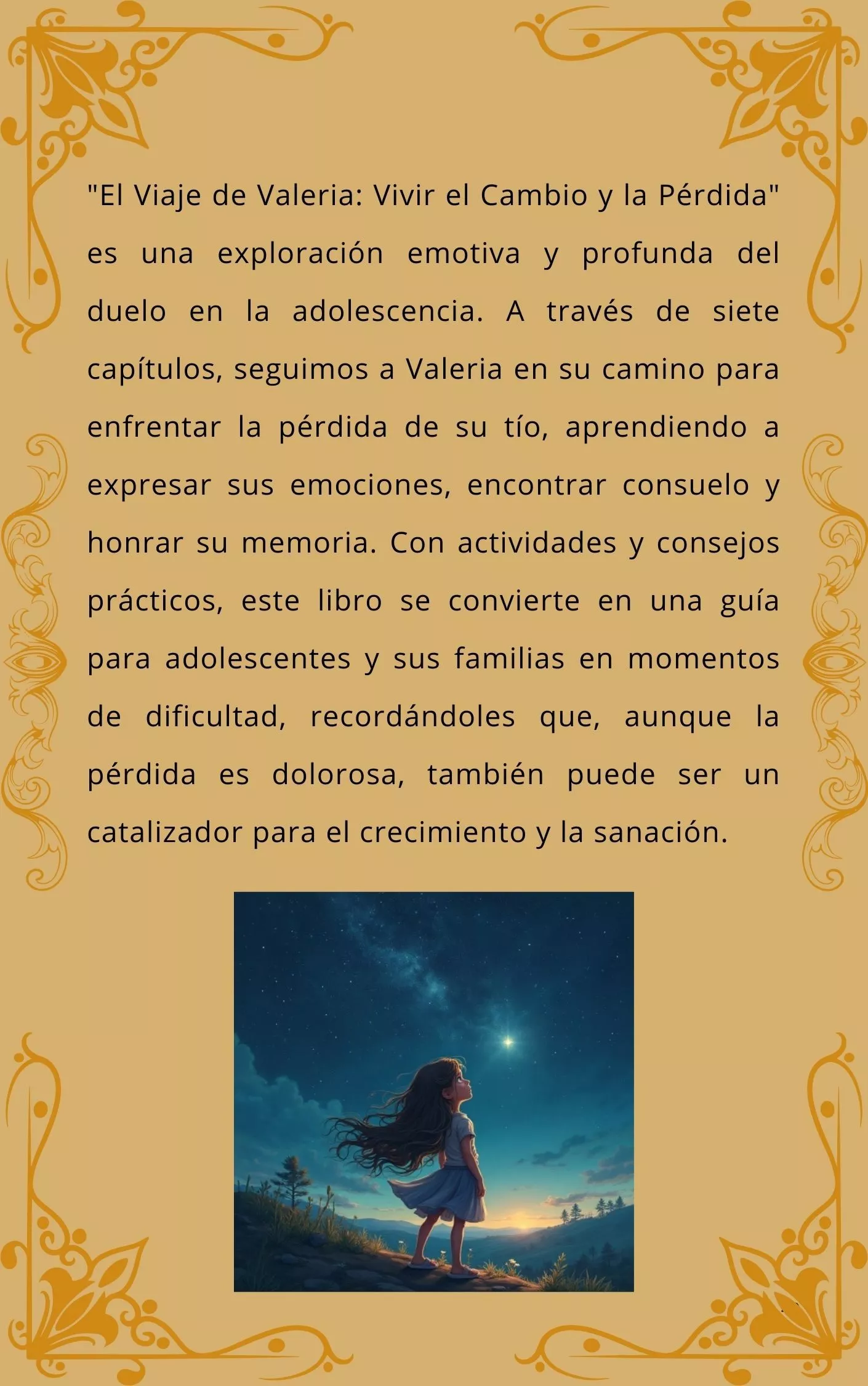 "El Viaje de Valeria: Vivir el Cambio y la Pérdida" es una exploración emotiva y profunda del duelo en la adolescencia. A través de siete capítulos, seguimos a Valeria en su camino para enfrentar la pérdida de su tío, aprendiendo a expresar sus emociones, encontrar consuelo y honrar su memoria. Con actividades y consejos prácticos, este libro se convierte en una guía para adolescentes y sus familias en momentos de dificultad, recordándoles que, aunque la pérdida es dolorosa, también puede ser un catalizador para el crecimiento y la sanación.